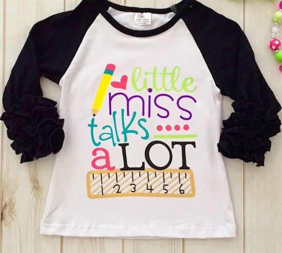 Reads "Little Miss Talks Alot" in fun colorful writing.