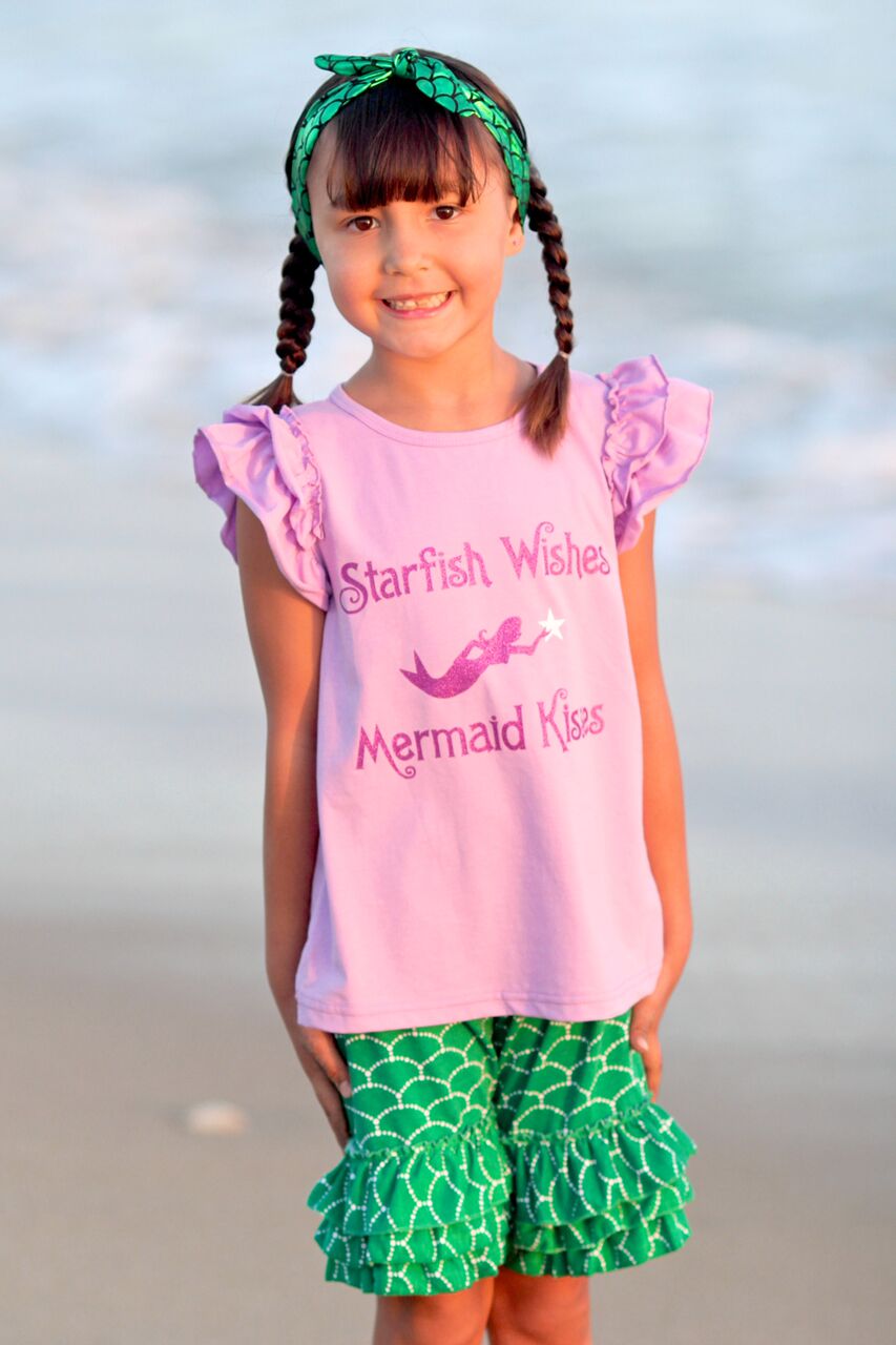 Shirt is adorned with "Starfish Wishes Mermaid Kisses " in glitter writing and ruffle flutter sleeves for a special touch.
