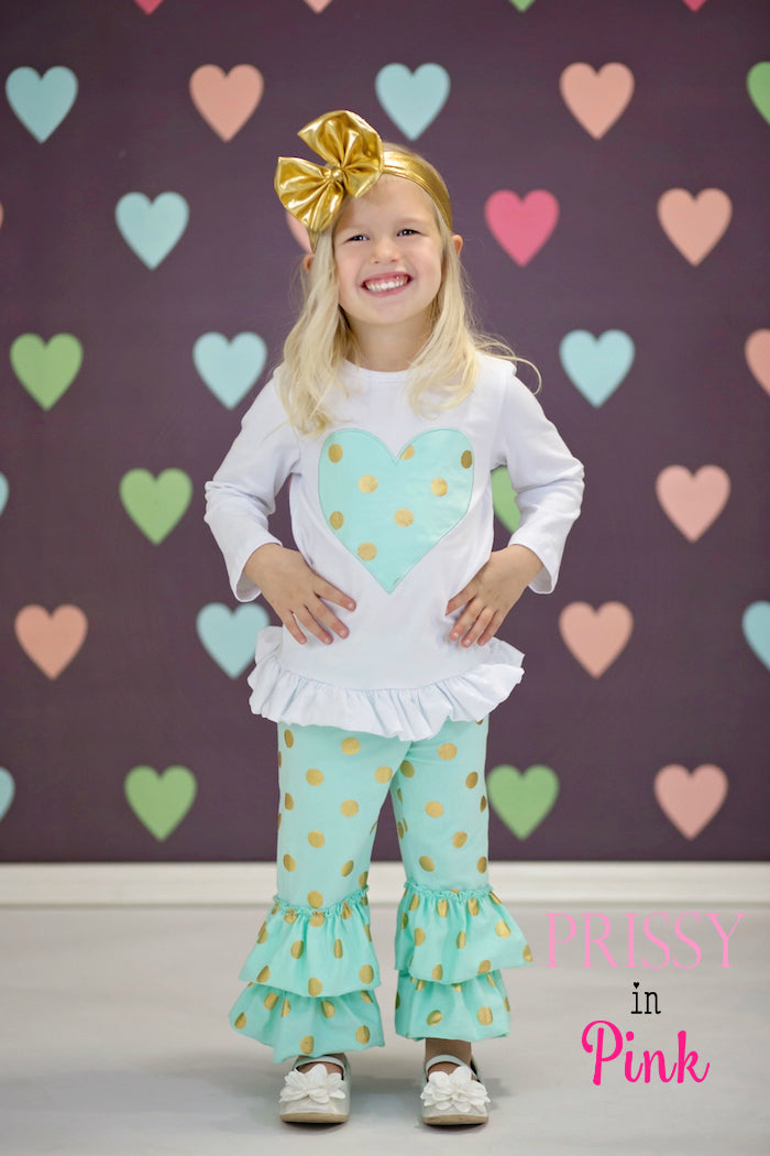 Includes the long sleeve applique heart top & matching gold polka dot pants!
